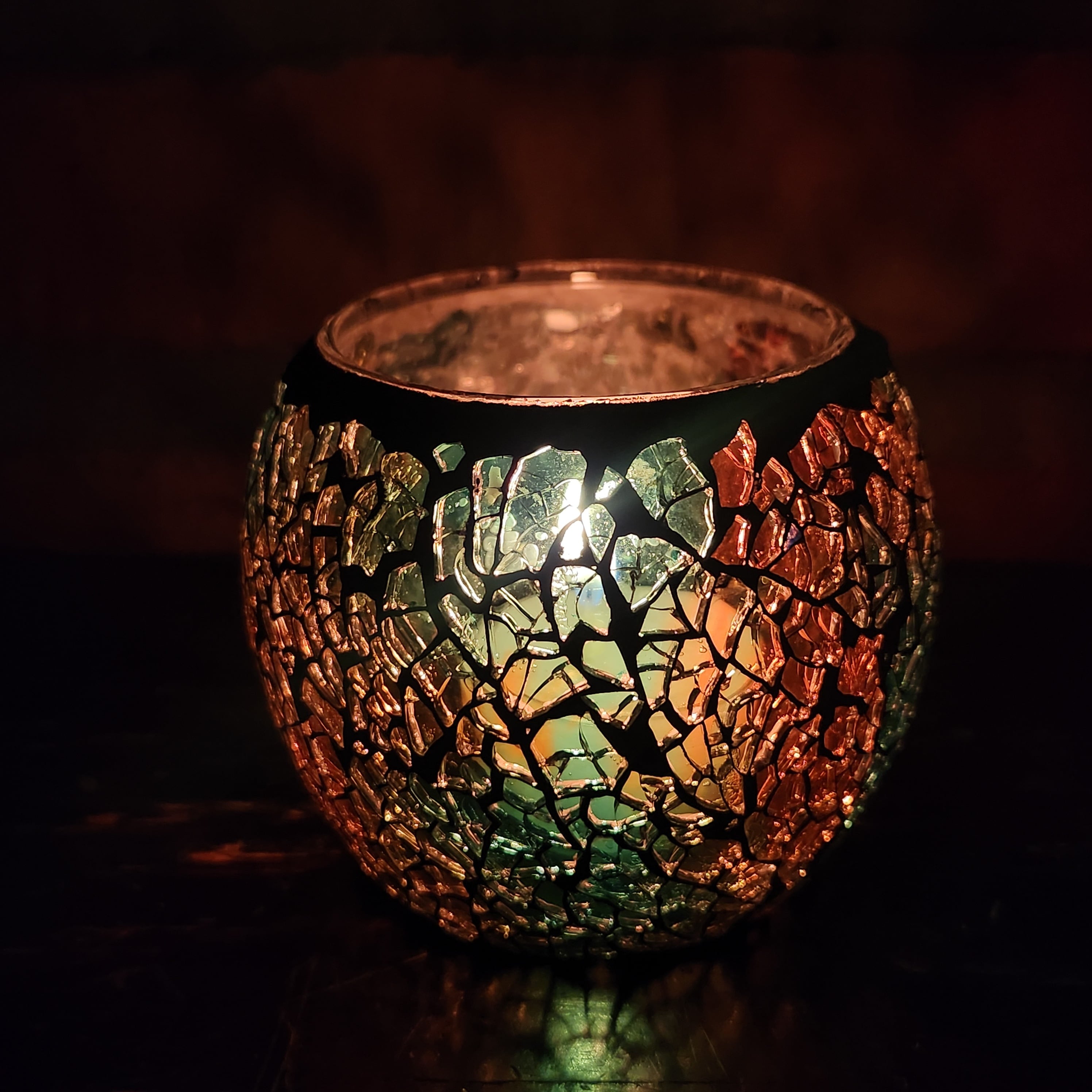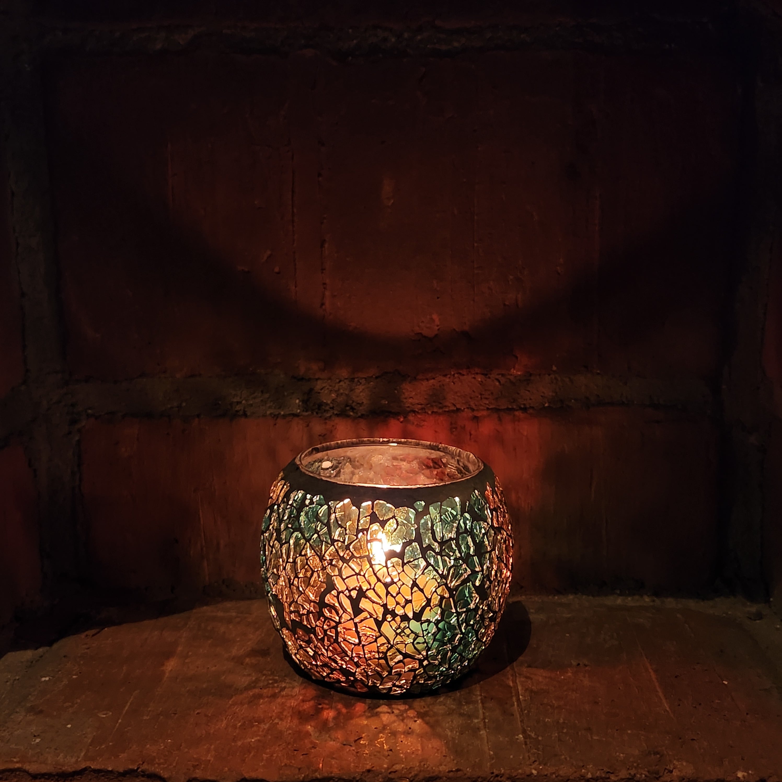 ティーライトキャンドルを入れて火を灯すと細かなクラッシュガラスを通して鮮やかなあかりが灯ります。